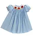 Made from soft blue gingham, this classic bishop-style dress features beautifully hand-smocked red apples with ABC embroidery across the neckline. Puff sleeves with red rick rack trim and a flowing, full-body silhouette.