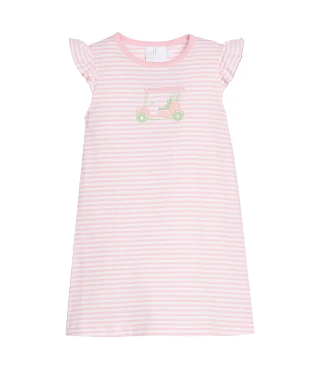 Your little caddie will be ready to par-tee in Little English's Golf Cart Applique Tilly Dress! Made from 100% cotton, this light pink and white striped dress features angel sleeves and an adorable blue and green golf cart appliqué in the center.