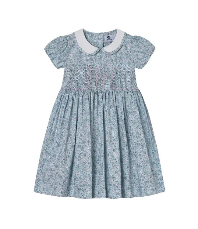 This pale blue girls dress features a scattering of tiny birds and branches on a timeless silhouette. Finished with a white Peter Pan collar edged in fabric piping and softly puffed sleeves, the design balances classic detail with a light, summery look.