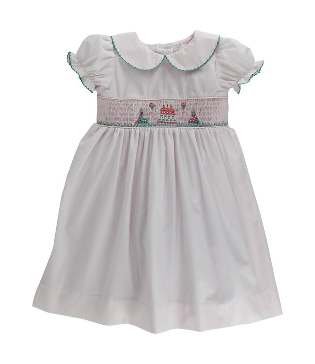 Celebrate her special day in style with Bailey Boys' Birthday Bash Dress! This sweet pink dress features hand-smocked embroidery with birthday motifs like cakes and party hats. Designed with a scalloped Peter Pan collar, puffed sleeves, and ruffled trims, it combines charm and comfort. Ideal for parties and photos, this dress adds a classic, festive touch to any little girl’s celebration.