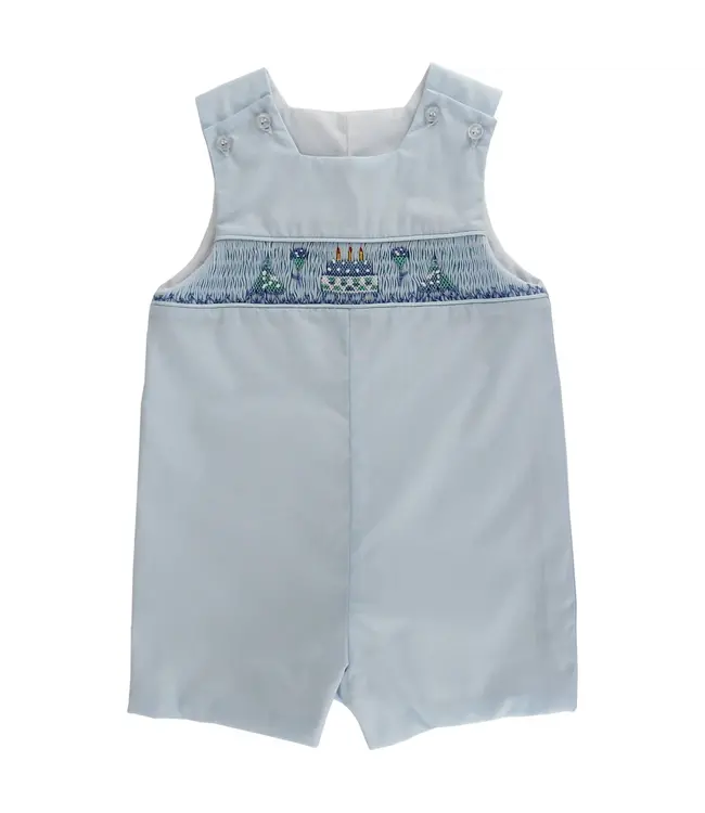 This classic light blue romper features beautifully hand-smocked birthday details, complete with a cake and balloons for a festive touch. Designed with buttoned shoulders and inner leg snaps, it ensures easy dressing and all-day comfort.