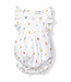 Behold all the ingredients for a child’s idyllic birthday fete: striped party hats, cake with candles, beribboned presents and balloons! This darling romper features sweet ruffle details and is finished with delicate pearl buttons. Read more.