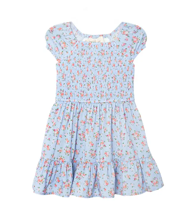 This soft, breathable light blue dress features a smocked bodice, short puffed sleeves, and a gathered skirt with a ruffled hem. Read more.