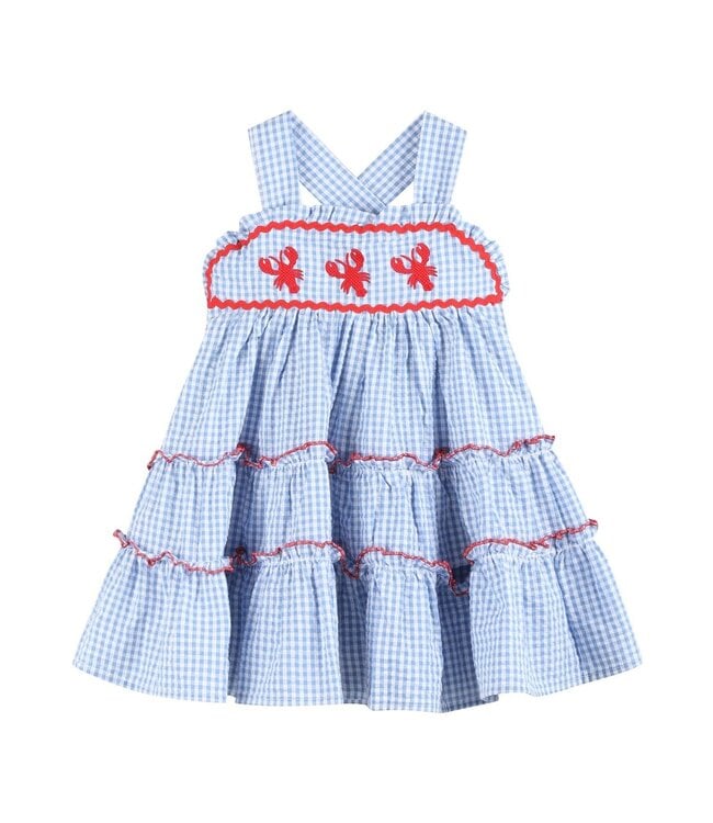 Made from soft, breathable cotton in a classic blue gingham, this dress features adorable red crawfish embroidery and red trim details. Perfect for crawfish boils, coastal vacations, or warm-weather celebrations, it's a standout piece full of charm.