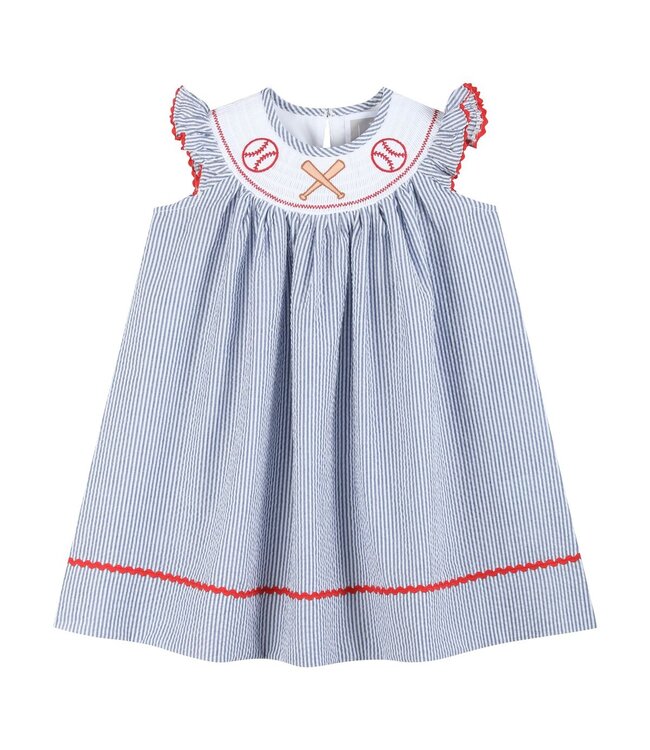 Lil Cactus Blue Seersucker Baseball Smocked Bishop Dress