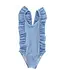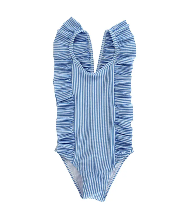Bailey Boys' Blue Stripe Seersucker One-Piece Swimsuit is designed with soft, textured seersucker fabric in classic blue and white stripes. Ruffle accents add a playful touch, while the fully lined design ensures all-day comfort and coverage.