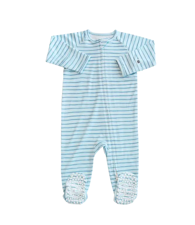 Sweet Bamboo's Blue Stripe Zip Footie is equipped with a smooth 2-way zipper, silicone grips on the foot pads and fold-over handcuffs. Plus, its silky-soft fabric hugs in all the right places to show off those baby curves.