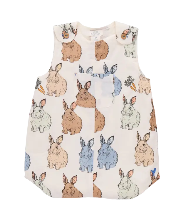 The Noah Jumper features a sweet blue vintage bunny print in soft 100% cotton. Designed with wood buttons at the shoulder and finished with a playful front pocket, this timeless one piece is perfect for everyday wear and first Easter celebrations.