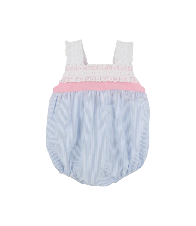 This precious Babs Bubble in Breakers Blue Seersucker with Sandpearl Pink is the outfit that will get unlimited compliments! The timeless seersucker keeps her comfortable on warm days while the adorable bubble silhouette brings that irresistible vintage charm that never goes out of style. It's the kind of outfit that makes you want to plan extra outings just so she can wear it—because cuteness this good deserves to be seen!