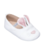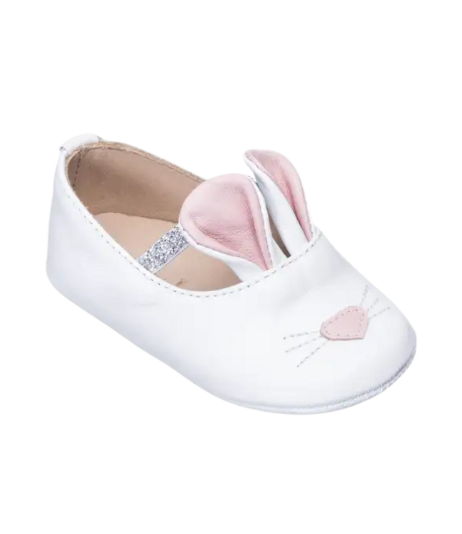 Baby girls pre-walker shoes, made in soft leather. They feature bunny ears on the front, a flexible leather outer sole, soft leather lining, and an elasticated silver strap over the foot.
