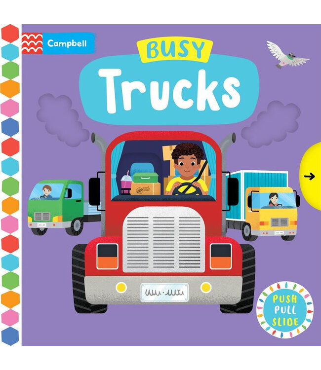 Push, pull, and slide the tabs to help the Busy Trucks with their important jobs! Collect the recycling, dump the rubble and tow the broken-down car to the garage.