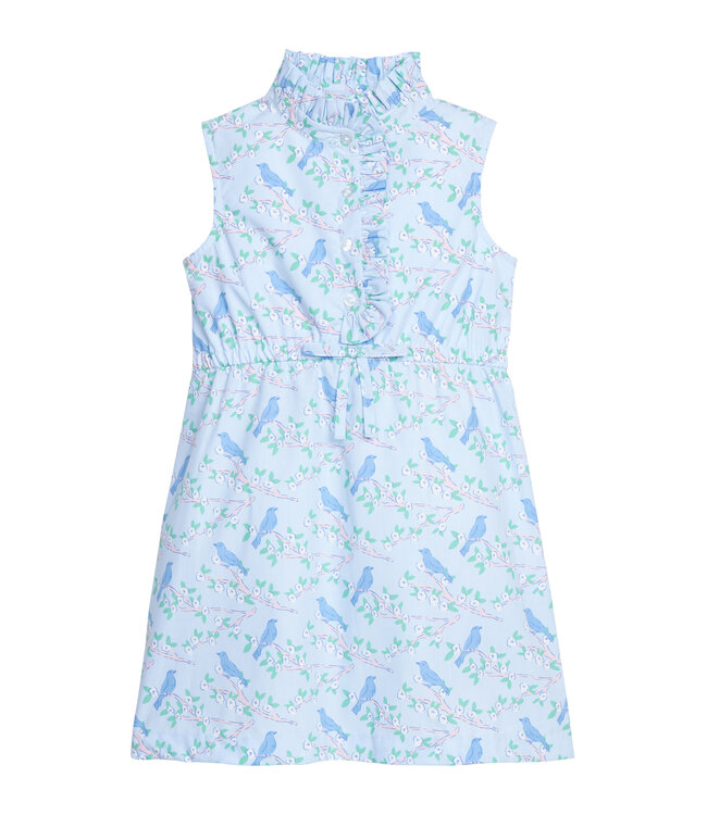 LE's Cherry Blossoms Collection features a charming print of blue birds on cherry blossoms set against pale blue. The sleeveless Ruffled Shirt Dress is a beautiful dress for older girls with a drawstring tie plus elastic at the waist for the perfect fit!