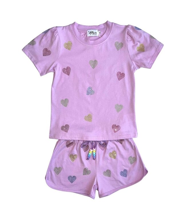 Brighten up any day with this set, featuring colorful crystal heart embellishments. The top showcases subtly puffed sleeves, adding a stylish touch. Perfect for warm weather outings, playdates, or adding a bit of sparkle to everyday activities.