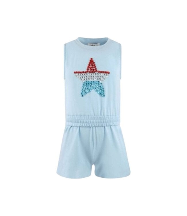 Light blue sleeveless short set with a dazzling crystal star embellishment. Elastic waistband for a secure and flexible fit, perfect for active days. A statement piece with a patriotic and stylish twist!