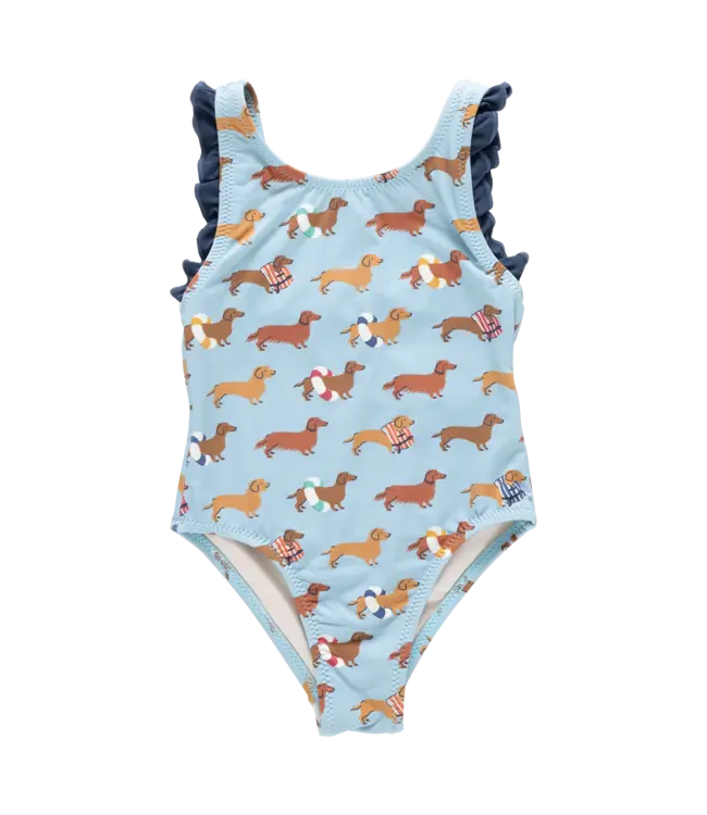 An updated fit makes this Swim Dachshunds silhouette extra comfortable and flattering. A dark blue ruffle at the arm holes finished with matching pearl stitching adds a tailored touch, while the playful dachshund print brings personality to every pool day
