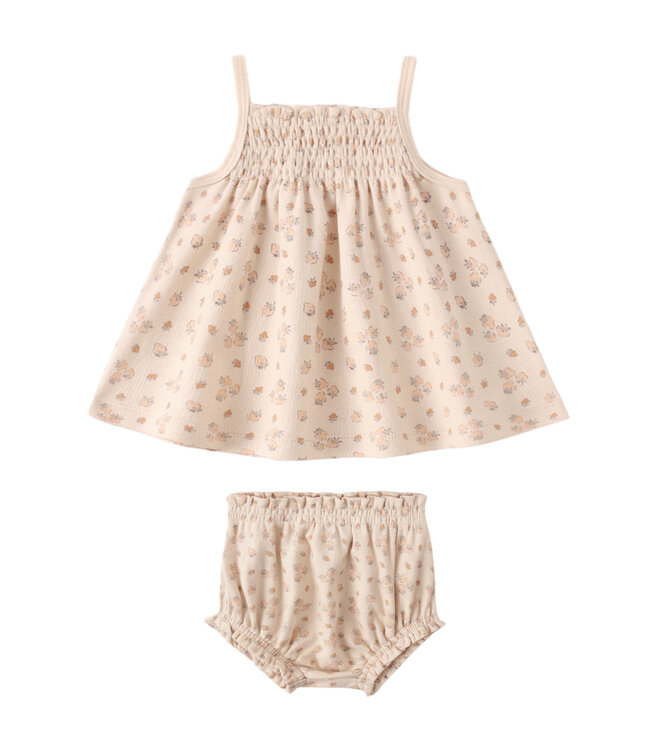 Quincy Mae's smocked tank and gathered bloomers set is a sweet and easy look for spring! Featuring their ‘strawberries’ print on an 'ecru' hue.