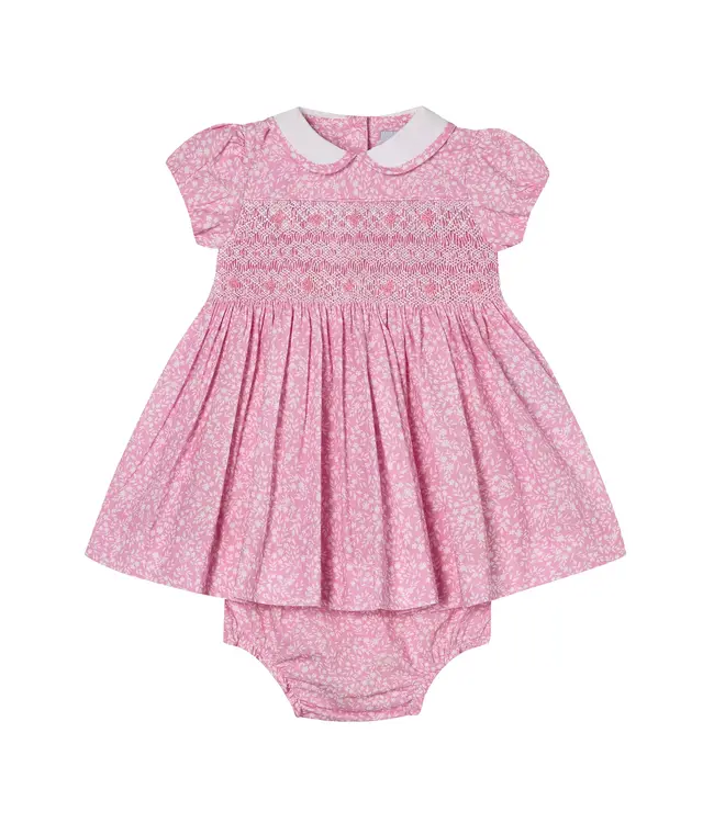 Pretty in pink! This hand-smocked baby dress features a soft white floral print on a pink backdrop and a crisp Peter Pan collar with delicate fabric piping. Sweet puff sleeves add extra charm, and the matching bloomers complete the adorable set.