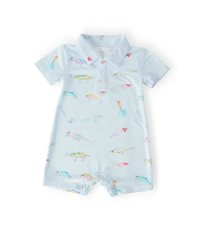 Mila & Rose's super soft Fish Hooks Polo Shorty one-piece is perfect for your baby boy this summer! Featuring an adorable fishing print and button snap closure for easy diaper changes.
