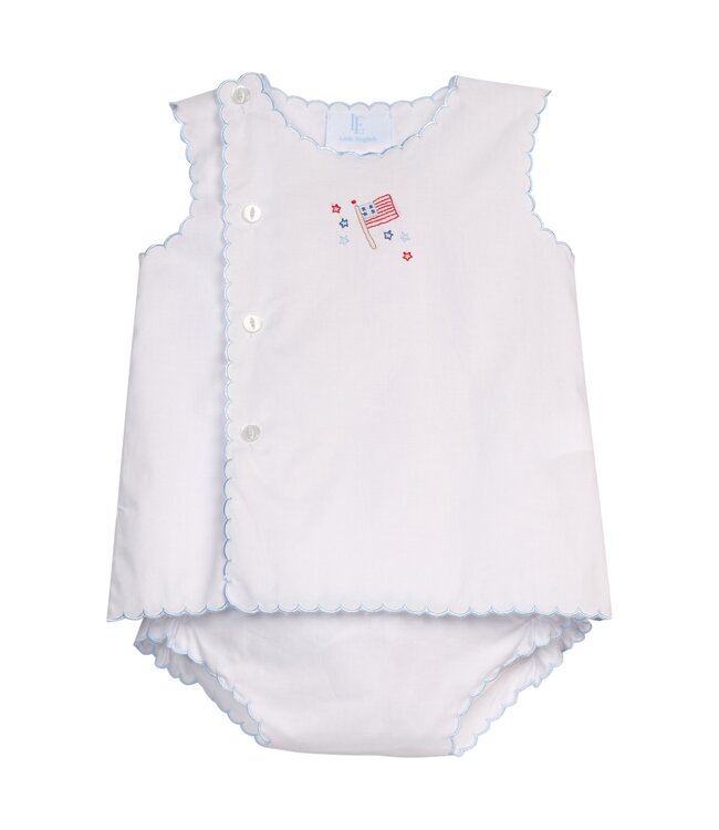 New style alert! Little English's Davis Day Set for is a beautiful two-piece set for babies featuring 100% white cotton fabric, delicate scalloped edging trimmed in light blue, and adorable flag embroidery just perfect for baby's first 4th of July. Buttons down the front allow for easy dressing and the light-weight fabric makes this an ideal choice for hot summer days.