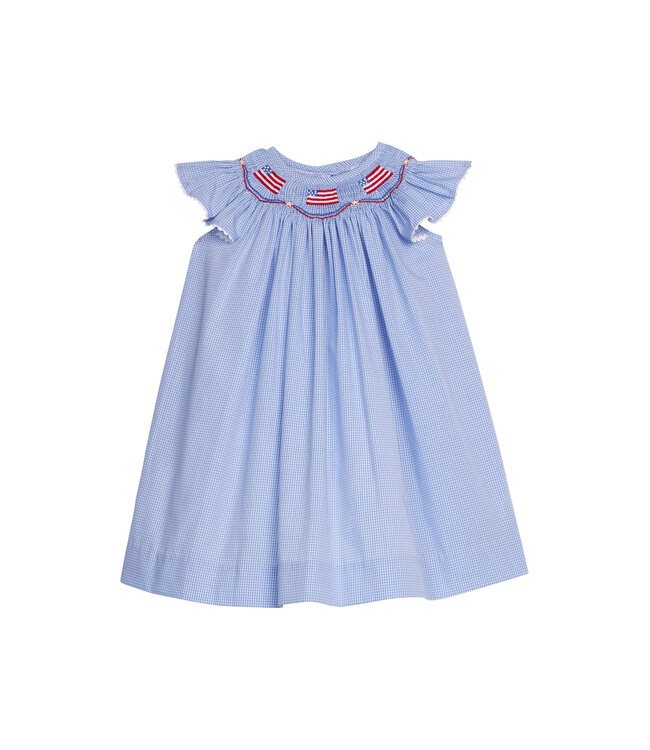 Little English's Smocked Bishop Dress features hand-smocked American Flag bunting - perfect for celebrating America's 250th anniversary! White ric-rac trim on the sleeves is a fun addition to this timeless bishop silhouette for little girls. Coordinate siblings in the Star Spangled Collection for fun and festive family photos!