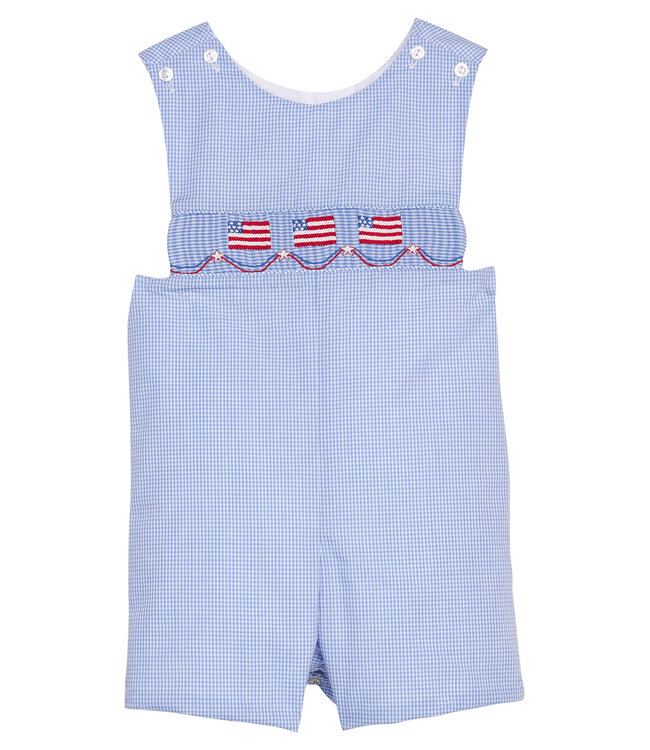 Little English's Smocked Shortall for toddler boys features hand-smocked American Flag bunting - perfect for celebrating America's 250th anniversary! Wide cut sides make this a breezy option for summer weather. Coordinate siblings in the Star Spangled Collection for fun and festive family photos!