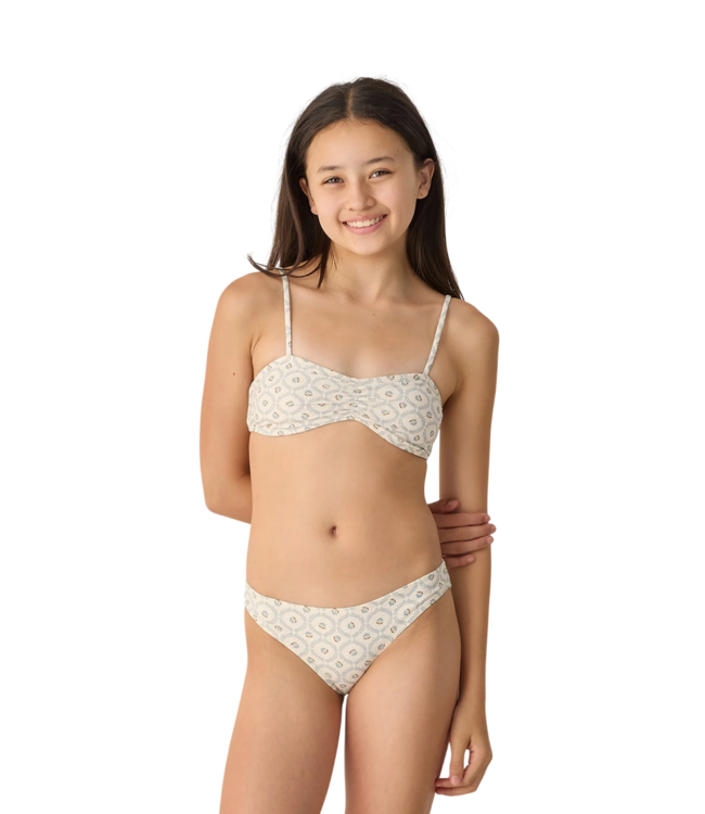 Rylee + Cru's Cardiff Bikini Set featuring a cinch top with adjustable straps and matching bottoms. UPF 50+. Featuring their 'green fleur' print on a 'natural' hue.