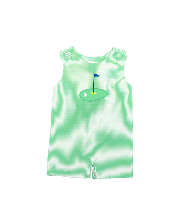 Made from soft, breathable cotton, Saltwater Boys Co.'s Jack Green Stripe Golf Shortall features a playful football appliqué over a classic striped pattern. Featuring snaps at the seat to make diaper changes quick and hassle-free, and functional shoulder buttons.