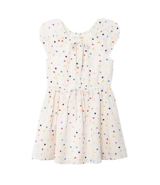 This short sleeve playful polka dot dress features a gathered waistline with bow details and on the neckline. This fabric is airy and light, perfect for any occasion.