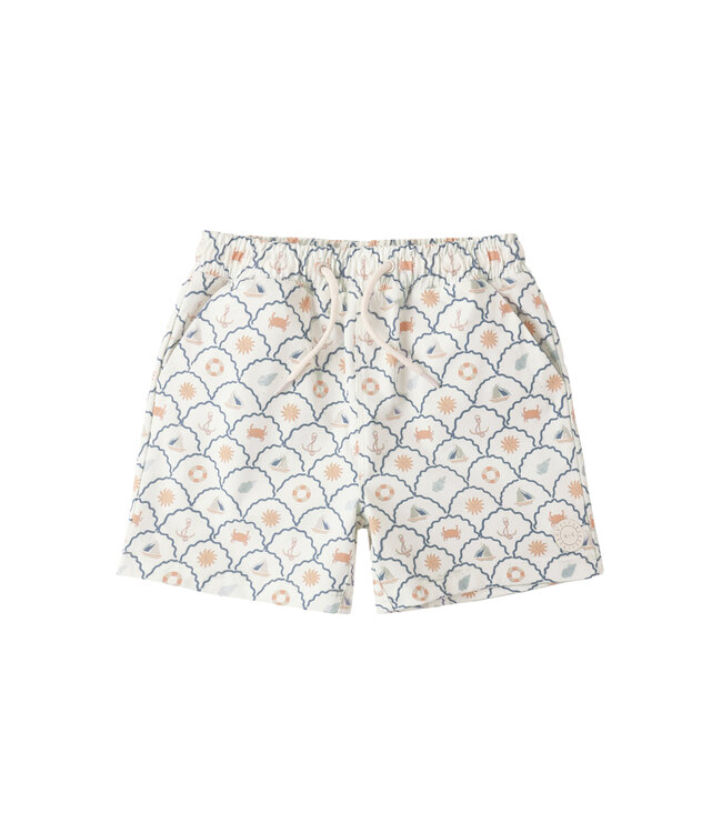 These soft boardshorts are perfect for pool and beach days! Featuring an elastic waistband with adjustable drawstring and pockets. UPF 50+. Featuring Rylee + Cru's 'nautical' print on an 'ivory' hue.