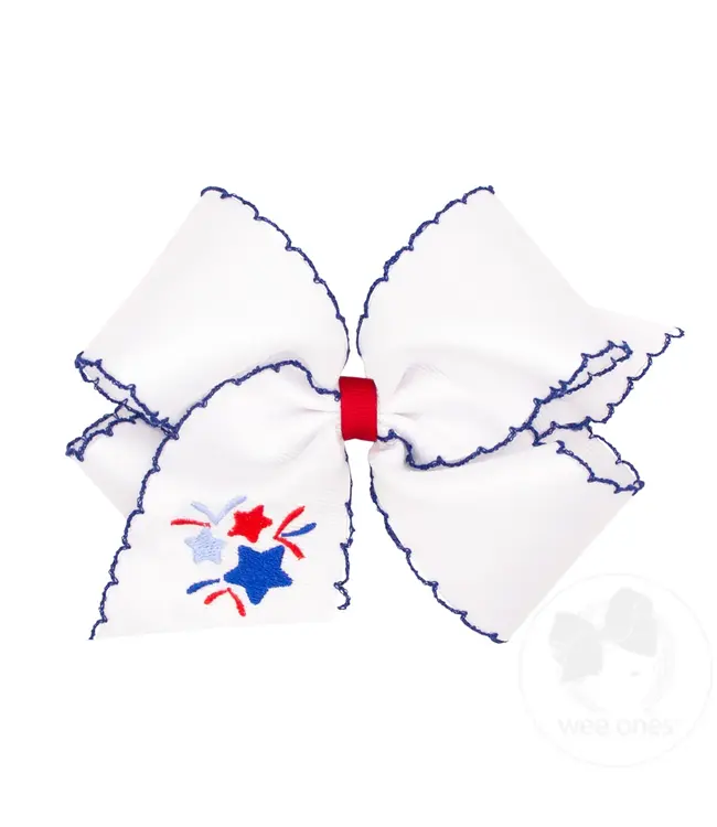 Make her patriotic look extra bold with Wee Ones king size firework bow. Featuring festive embroidered fireworks and blue moonstitch edging on crisp white grosgrain, it’s perfect for parades and celebrations—finished with the WeeStay™ no-slip clip.