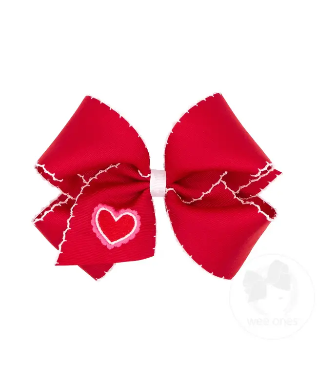 The Wee Ones King Red Moonstitch Heart Bow makes a bold Valentine statement with scalloped moonstitch edges and a sweet embroidered heart. Finished with Wee Ones’ WeeStay™ no-slip clip, it’s made to stay put all day long.