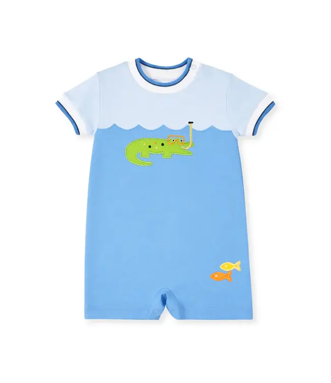 Soft shades of blue set the scene for this playful knit shortall from Florence Eiseman, featuring a cheerful alligator appliqué on an underwater adventure. A surprise fish detail at the back adds extra charm.