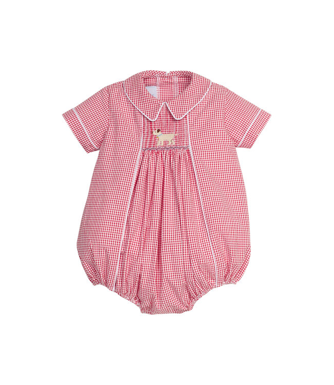 Celebrate a boy’s best friend in classic Little English style! The Chest Smocked Bubble is a red seersucker gingham style with a hand-smocked lab at the center chest. Featuring short sleeves, a peter pan collar, and white contrast piping.