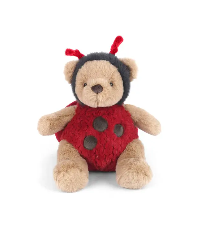 Buzzing with charm and ready for adventure, Leah Ladybug Bear is the cutest cuddle bug around! Dressed in a fuzzy red ladybug suit with bold black spots and tiny antennaes perched on her head, Leah is part teddy, part bug, and all heart.