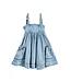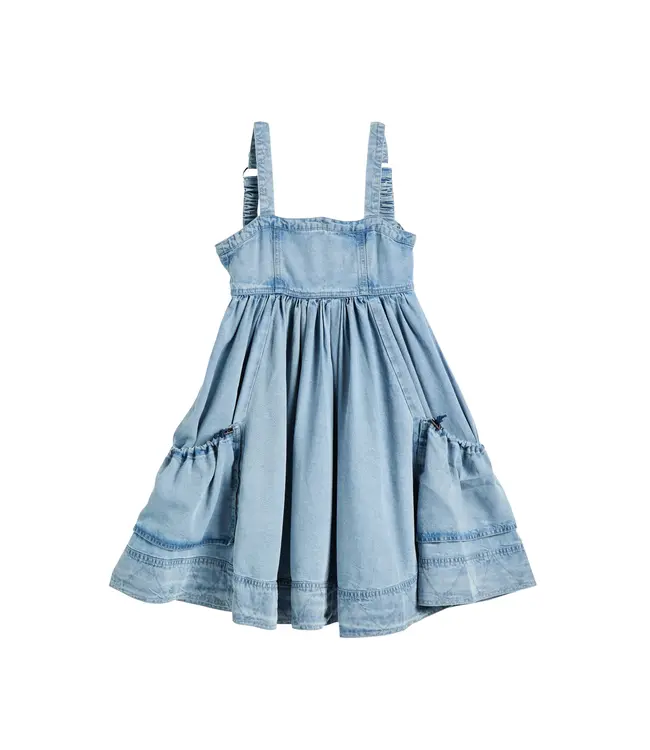 Tractr's light indigo denim cargo strap dress features a square neckline with wide shoulder straps and a softly gathered waist that creates a relaxed, flared silhouette. Large cargo-style patch pockets add a casual utility detail while the woven denim keeps the structure clean and easy.