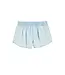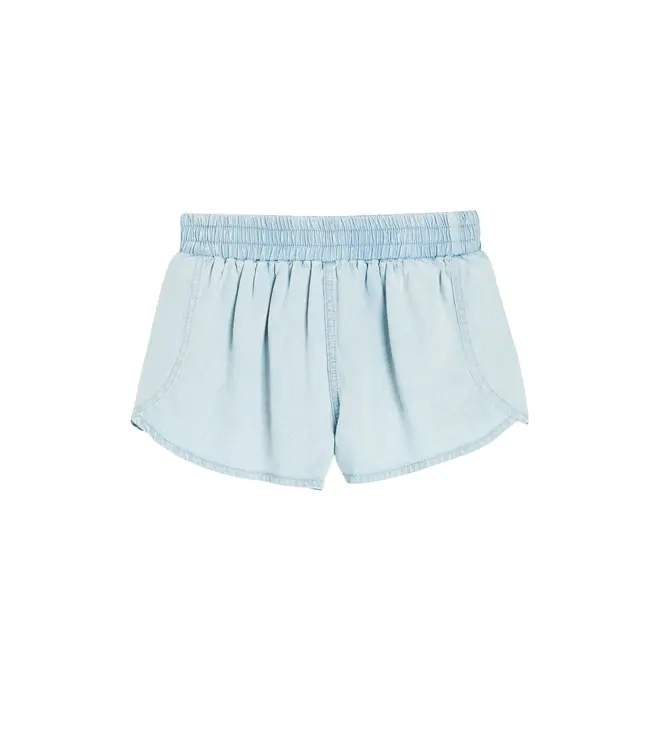 These light indigo pull-on shorts from tractr feature a relaxed silhouette with a soft drape and curved dolphin hem. The elastic waistband and rounded side shape create an easy, casual look designed for comfortable everyday wear.