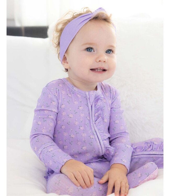 LEV Baby's Lila Ruffled Zip Footie is made from ultra-soft bamboo viscose for all-day comfort. Designed with a double zipper, ruffle detail, heart-shaped grips, and built-in mittens for newborn sizes—perfect for cozy days and easy nights.