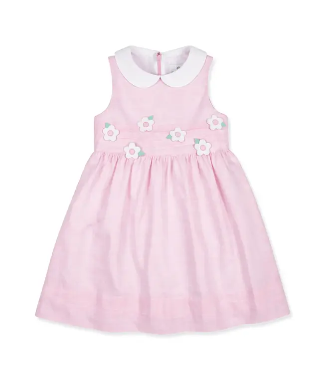 Soft, sweet, and perfectly polished for warm-weather days, this dress is crafted from pink linen look woven in breathable 100% cotton. A crisp white collar frames the neckline, while appliqué flowers at the front waist add a charming, feminine touch.