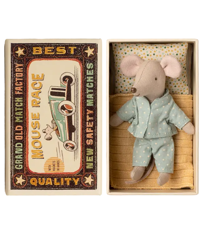 A Maileg favorite, this Little Brother Mouse comes tucked inside his very own matchbox bed. Dressed in cozy pajamas, he rests on a soft blanket with a little pillow, ready for sweet dreams.