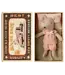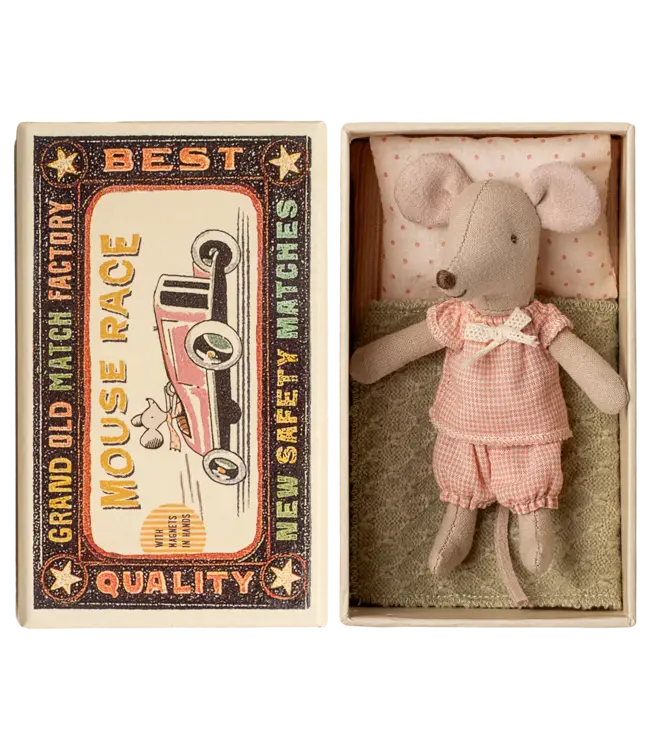 A Maileg favorite, this Little Sister Mouse comes tucked inside her very own matchbox bed. Dressed in cozy pajamas, she rests on a soft blanket with a little pillow, ready for sweet dreams.