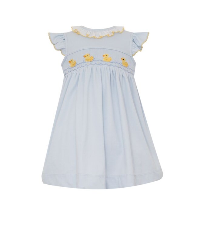 Classic and sweet, Petit Bebe's Light Blue Knit Sleeveless Duckies Dress features soft knit fabric with delicate embroidered ducklings across the chest and charming ruffle details. A timeless choice for Easter, spring celebrations, and baby girl portraits