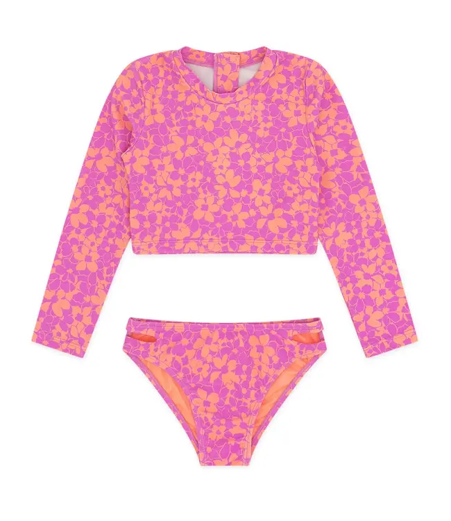 Long sleeve cropped rash top with back zipper and flattering bottoms featuring slit detail at sides.