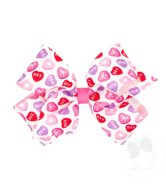 The Wee Ones Medium Conversation Heart Bow is full of Valentine charm, featuring playful candy heart prints with sweet sayings like BFF and HUG. Perfect for Valentine’s Day and beyond, finished with Wee Ones’ WeeStay™ no-slip clip.