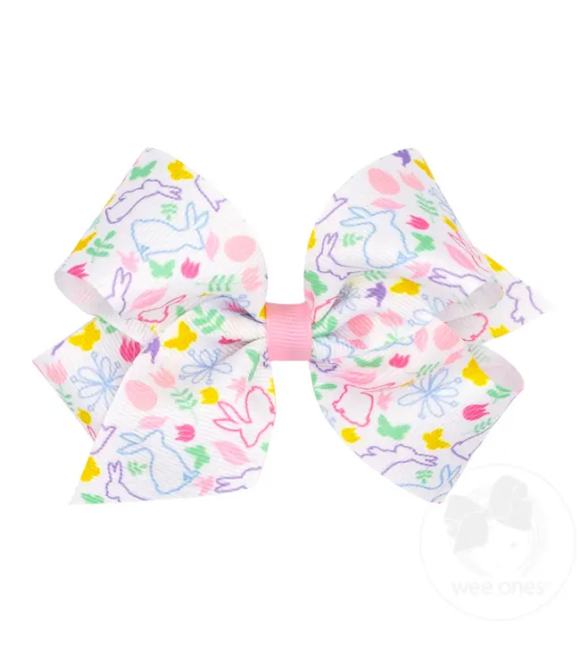 The Wee Ones Medium Easter Print Bow adds a cheerful pop of spring to her Easter outfit. Featuring playful pastel bunnies, florals, and eggs, this bow is finished with Wee Ones’ WeeStay™ no-slip clip to stay secure all day.