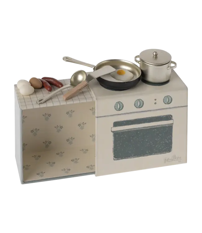 A small kitchen set for any mouse. This set include kitchen utensils, eggs and sausages to make the perfect brunch. It is packed in a paper box decorated as a small kitchen so it becomes a part of the play and storytelling.