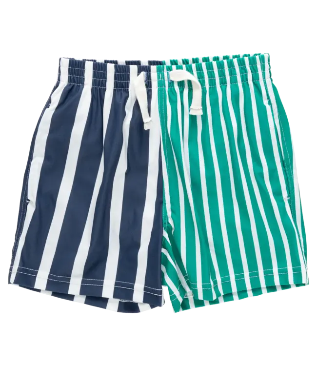 Bold vertical stripes in blue and green give this trunk a crisp, nautical feel, while the contrast red back pocket adds a playful pop. Side pockets and an easy elastic waist keep things practical for all-day movement, from dock jumping to pool races.