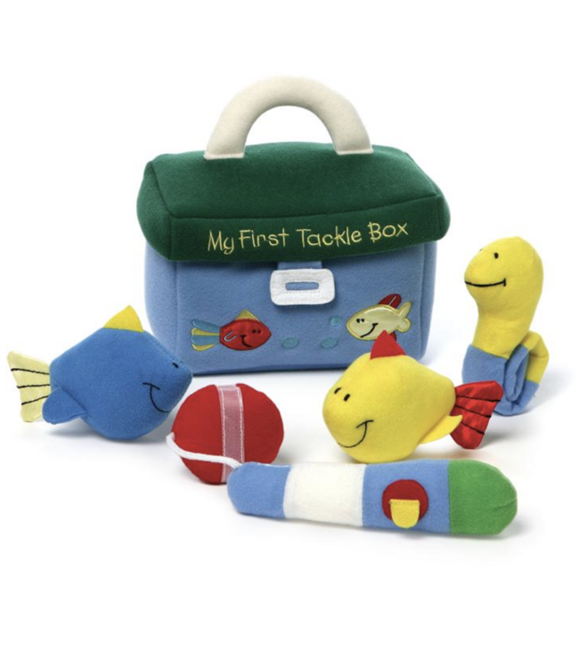 Gone fishing! Teach them the joys of a relaxing day on the boat with the My First Tackle Box playset. This adorable five-piece soft plush playset includes one each of the following items inside a self-contained plush tackle box: a rod with touch and close fastener for sticking to fish, a worm crinkle toy, a fish squeak toy, and a fish with sound. Your child's safety is our top concern, so this Baby GUND product features embroidered details. This adorable plush playset is machine washable for easy cleaning and appropriate for all ages. Just like the rest of the innovative Play Soft collection, this 5-piece plush playset contains multiple ways to keep baby engaged through sensory play, encouraging exploration while helping develop dexterity and hand-eye coordination. Aside from sound toys, Baby GUND plush is machine-washable, and can be line-dried for easy cleaning. Appropriate for ages 0 and up.