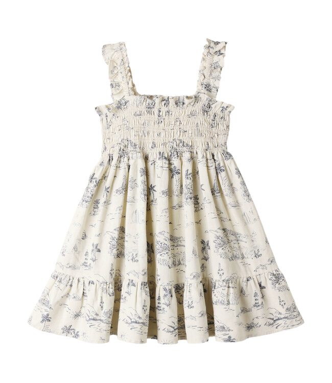 With gathered elastic straps, smocked bodice and a gathered ruffle bottom tier, Rylee + Cru's Sutton Dress is the perfect spring time look. Featuring an 'ocean toile' print on their 'natural' hue.