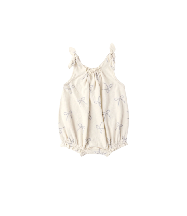 Rylee + Cru's soft bubble onesie features fixed tie shoulder straps and bottom snaps for easy changes. Featuring a ‘sailor bows’ print on an ‘ivory’ hue. A sweet simple print for warm summer days!