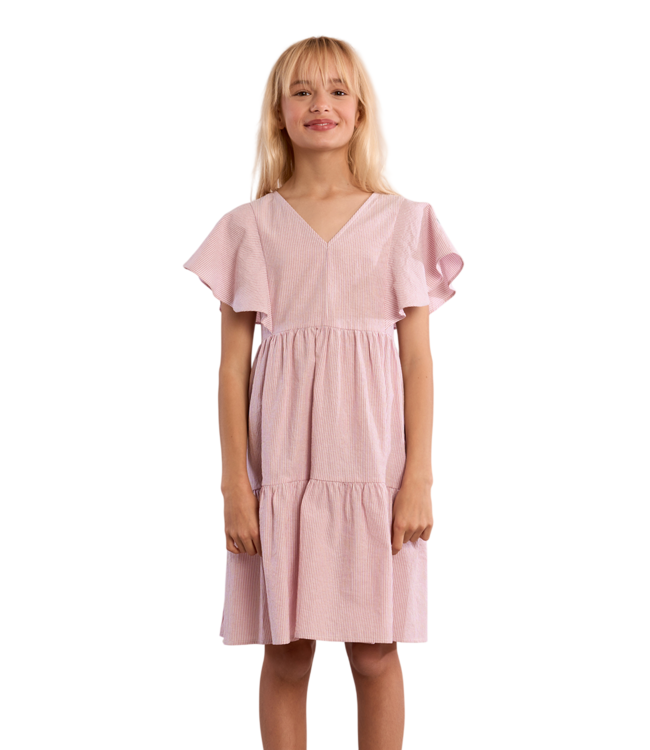 Pinstripe dress Flared babydoll cut V-neckline Flared sleeves Ruffle details Length from the shoulder 78cm for a 12 year old Read more.